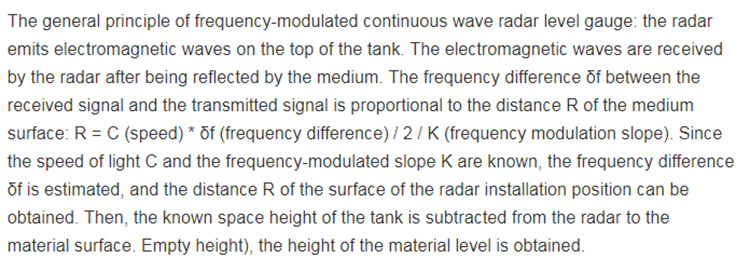 Illustrate:Radar Level Transmitter uses the operating mode of emission-reflection-receiving. Its antenna emitted extremely narrow microwave pulse , which travels at the speed of light. Part of its energy, which is reflected off the surface of targe medium, is received by the same antenna.