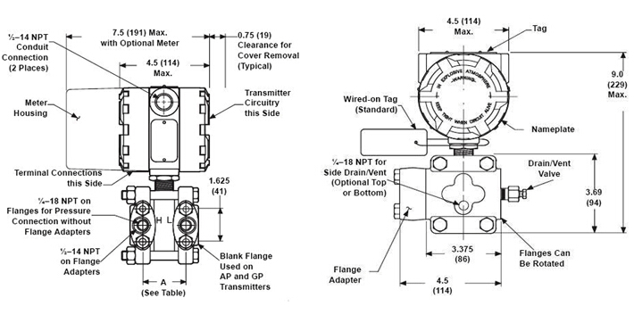 | Mounting | Directly supported by piping or optionally with mounting bracket for 2" pipes or with direct or remote seals. 3-way valve | |